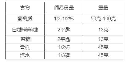 如遇到低血糖現(xiàn)象:出冷汗、手震、頭暈、四肢軟弱無力、神志不清,心跳加速或饑餓難忍,此時(shí)可選用一份純糖食物,以下食物每項(xiàng)含約10克糖質(zhì)或進(jìn)食2-3粒糖果,糖膠,果醬等均可較快地提升血糖。