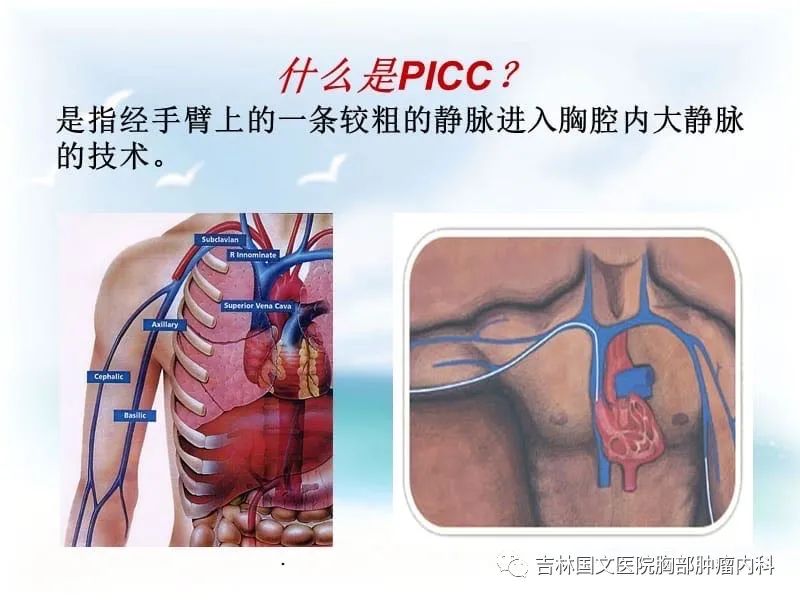 它是利用導管從外周手臂的靜脈進行穿刺,導管直接進入心臟附近的大靜脈。它避免了化療藥物與手臂靜脈的直接接觸。大靜脈血流量大,化療藥物可迅速稀釋,防止藥物對靜脈的刺激。