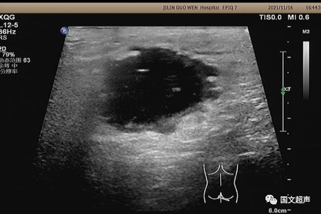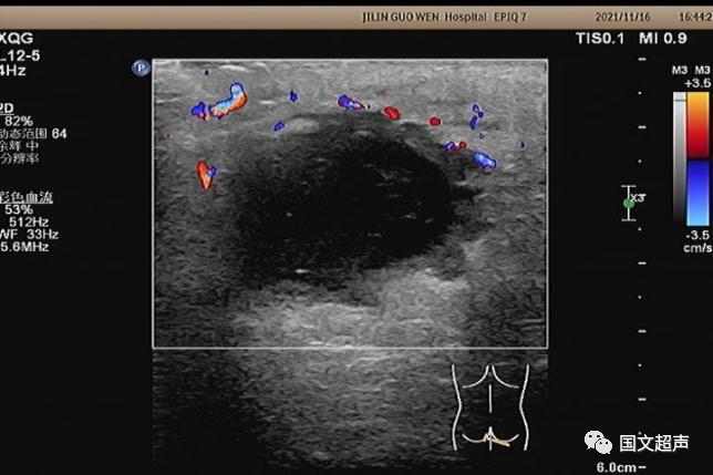 肛周:7點(diǎn)鐘方向皮下脂肪層內(nèi)探及不均質(zhì)低無(wú)回聲包塊,范圍約4.6*3.0cm,較淺處距體表約0.6cm,邊界不清,周圍軟組織回聲增強(qiáng),CDFI:周邊血流信號(hào)豐富,輕加壓探頭有涌動(dòng)感,如下圖: