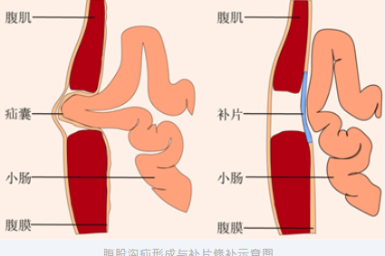 腹股溝疝形成與補(bǔ)片修補(bǔ)示意圖