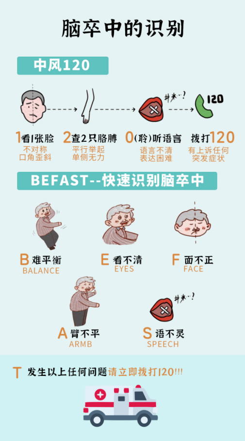 專家提醒:腦卒中發(fā)病急、進(jìn)展快,一旦出現(xiàn)以下癥狀,請(qǐng)立即撥打120急救電話:* 突發(fā)一側(cè)肢體無力或麻木* 突發(fā)口角歪斜、流口水* 突發(fā)言語不清或理解語言困難* 突發(fā)單眼或雙眼視力模糊* 突發(fā)眩暈、嘔吐、行走不穩(wěn)* 突發(fā)劇烈頭痛。