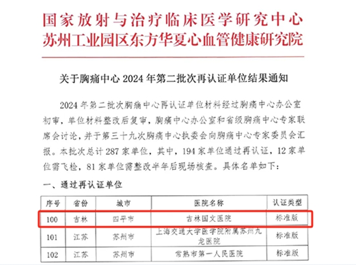 4月3日,吉林國文醫(yī)院胸痛中心以全優(yōu)成績通過國家級標(biāo)準(zhǔn)版“再認(rèn)證”,成為中國胸痛中心總部認(rèn)證的全國標(biāo)桿單位。這是該院繼2021年首次獲評后,第二次通過這一代表我國急性胸痛救治最高水平的國家級評審,標(biāo)志著其救治體系、質(zhì)控能力和區(qū)域協(xié)作水平持續(xù)穩(wěn)居“國家隊”行列。