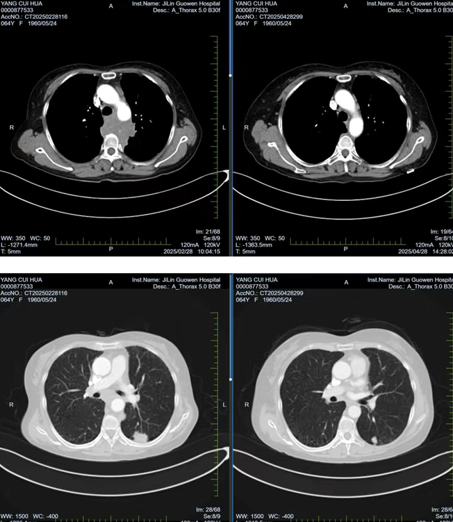 經(jīng)過(guò) 1 周期的免疫聯(lián)合化療后,患者的胸背部疼痛逐漸減輕,目前患者疼痛癥狀已得到改善,生活質(zhì)量得到了顯著提升。