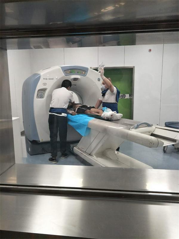 不遠(yuǎn)處可見120秦屯分站救護(hù)車正急速駛向我科,當(dāng)患者被抬下車查看患者意識模糊,躁動;而后迅速將患者安全安置在平車上緊接著將患者送往急診搶救室,我們科外科王明偉醫(yī)生也對患者全面查體,發(fā)現(xiàn)患者雙下肢都有明顯開放傷口,立即對傷口進(jìn)行加壓包扎,這時(shí)秦屯分站的救護(hù)車醫(yī)生也做了交接工作,患者是車禍外傷,到達(dá)現(xiàn)場時(shí)有兩名患者,一位當(dāng)場死亡,另一位則被送到我院,患者四肢頭面部均有開放傷,由于患者處于意識模糊狀態(tài),查體不配合也成為了較困難的干擾因素,外科醫(yī)生及時(shí)下達(dá)醫(yī)囑建立靜脈通路,由于患者的失血量可能過多,導(dǎo)致血管不充營,對護(hù)士進(jìn)行留置針穿刺術(shù)也考驗(yàn)的一定的專業(yè)素質(zhì),而我科搶救室護(hù)士迅速執(zhí)行完醫(yī)囑,并跟隨我科出診醫(yī)生去做相關(guān)的檢查。檢查也有了難題,由于患者處于意外事故,并沒有家屬陪同,關(guān)鍵患者是躁動加上意識不清,對于CT檢查也是嚴(yán)重的不配合,為了讓及時(shí)的檢查順利進(jìn)行,我科兩名出診醫(yī)生,田益竹、姜超穿上了鉛衣,負(fù)責(zé)固定注患者的體位,和液體的及時(shí)補(bǔ)充,檢查出骨盆粉碎性骨折,CT值班人員也幫助迅速出片,在電話與外科醫(yī)生做了溝通后,我科醫(yī)護(hù)迅速將患者送往ICU,完成了一次順利的綠色通道。